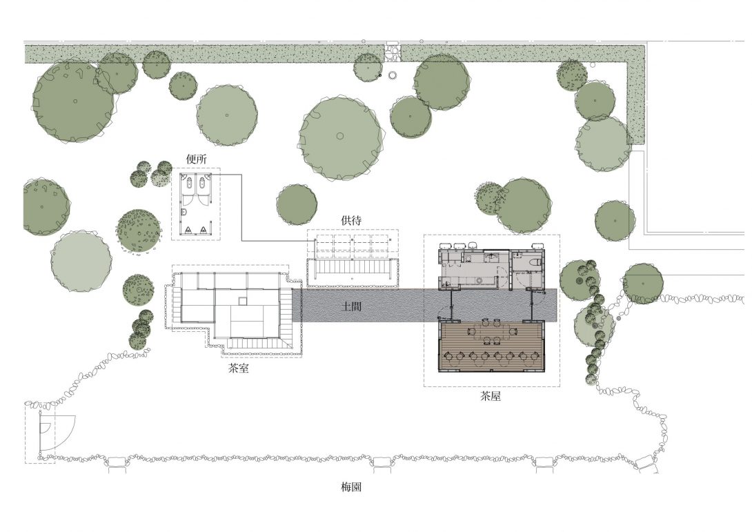 計画地は樹木の多い広大な庭園であり、近くには既存の茶室・供待(休憩のためのベンチスペース)・便所が存在しています。まずはそれら既存の建物・植物の位置を正確に測量し、茶屋を置く位置を定めるところから設計をスタートしました。